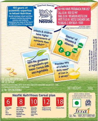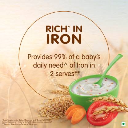 You can give your 10 to 12-month-old baby the nourishment it needs with the Nestle CERELAC Wheat-rice Mixed Vegetable cereal. It is rich in iron and supplies 19 essential nutrients, including minerals and vitamins, to your baby’s diet. You can fulfil up to 99% of your baby’s daily iron intake requirement by giving it two servings of this cereal. This cereal will surely be your baby’s favourite everyday meal as it is enriched with the goodness and deliciousness of milk, cereal, and vegetables.