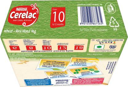 • Ingredients: Wheat flour (Atta) (49.8%), Milk based mix (Milk solids (31.2%) and Sugar), Sugar, Soyabean oil, Rice flour (3.3%), Cereal corn mix flakes (Corn flour (2.8%), Sugar, Malt extract, Mineral* and Antioxidant (alpha-tocopherol)), Carrot rice flakes (Sugar, Carrot puree (0.6%), Glucose syrup, Starch and Rice flour (0.04%)), Milk solids (1.5%), Tomato rice flakes (Tomato puree (0.2%), Sugar, Glucose syrup, Starch and Rice flour (0.01%)), Minerals* and Vitamins#. *Minerals: Calcium carbonate, Sodium chloride, Electrolytic iron, Zinc sulphate and Cupric sulphate. #Vitamins: Sodium ascorbate, Nicotinamide, dl-alpha-tocopheryl acetate, Calcium pantothenate, Thiamine mononitrate, Pyridoxine hydrochloride, Retinyl acetate, Riboflavin, Folic acid, Ergocalciferol and d-Biotin. Carriers: Maltodextrin and Glucose syrup